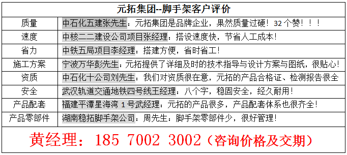 元拓腳手架建筑材料的客戶中,很大一部分是老客戶。為什么客戶定購過一次的,會一而再,再而三的選擇元拓腳手架建筑材料呢?因為客戶對元拓腳手架的評價是:元拓腳手架滿堂腳手架好用不貴,價位合理,經久耐用,而且服務一流,品牌響亮。 元拓腳手架碗扣式多功能滿堂…